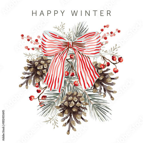 © ojardin, Obraz premium Christmas greeting card, text, white background. Pine cones, twigs, red berries, big bow. Vector illustration. Poster, banner design template. Winter nature. Xmas holidays