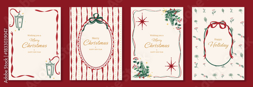 © TWINS DESIGN STUDIO, Obraz premium Christmas greeting card vector illustration with Happy New Year and Happy Holiday in cream and red vintage design featuring ribbons, ornaments, holly leaves and pine branches.