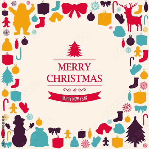 © switchpipi, Fototapeta premium Christmas greeting card with merry christmas and happy new year wishes. Christmas design elements. Vector