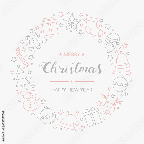 Fototapeta premium Christmas greeting card with wreath made of festive icons. Vector