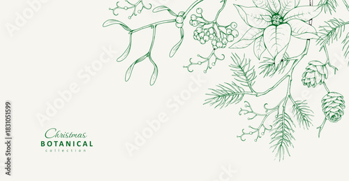 © merfin, Obraz premium Christmas greeting illustration with winter plants and traditional New year decorations. Holiday card or invitation with hand drawn botanical engraving design