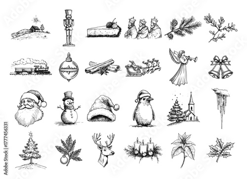 Obraz premium Christmas Hand Drawn Sketch Icon Set Vector Holiday and Winter Doodle Elements