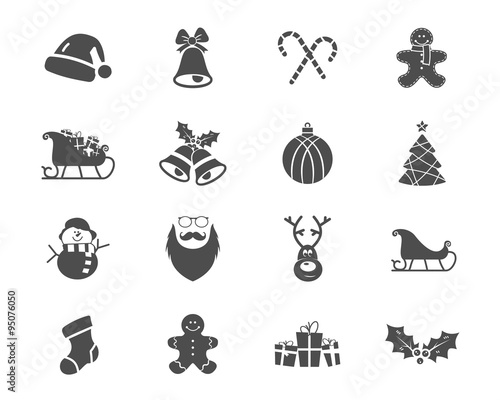 © jeksonjs, Naklejka premium Christmas, Happy New Year and Winter icons collection. Set of holidays symbols, elements - santa, deer, gift, snowman, candy, toys for web, app, ptint. Vector monochrome silhouette