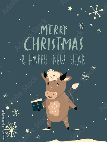 Fototapeta premium Christmas,Happy New Year Greeting Card.Cute Cartoon Bull with Gift. Cow...