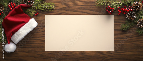 © Fernando, Fototapeta premium Christmas Hat and Pine Branches with Blank Paper on Wooden Background, Christmas Hat and Pine Branches with Blank Paper on Wooden Back