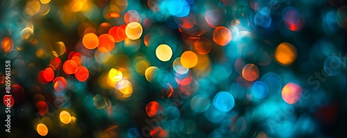 © Diffin, Naklejka premium Christmas holiday background with defocused silhouette of Christmas tree glowing light bokeh lights