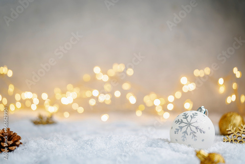 Fototapeta premium Christmas Holiday background with snow, fir tree and decorations with christmas light behind. Christmas white and golden balls on a winter festive background.