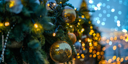 © eskstock, Fototapeta premium Christmas holiday blinking abstract background with decorated christmas tree. Copy space for your text.