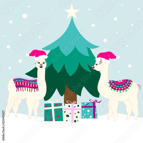 Obraz premium Christmas holiday card with cute llamas and tree vector