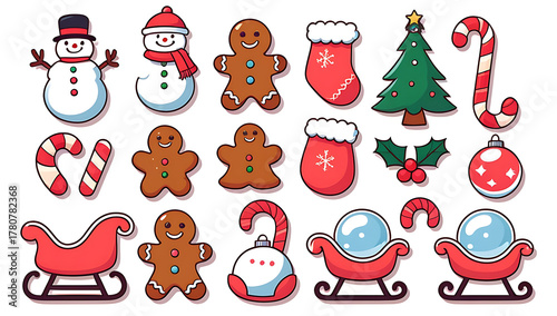 © Amin, Naklejka premium Christmas Holiday Cartoon Vector Set Featuring Snowmen Gingerbread Men and Festive Decorations for a Happy New Year