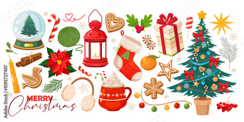Fototapeta premium Christmas holiday elements includes winter berries, gingerbread cookies, holiday tree, lantern and canles, gift box, etc.