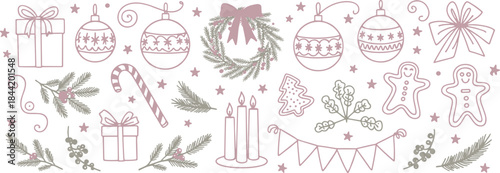 Fototapeta premium Christmas Holiday Elements Wreath Gifts Ornaments and Gingerbread winter festive