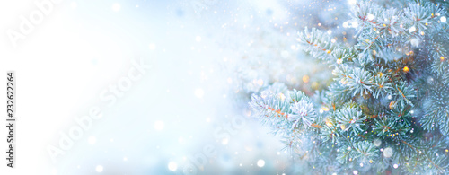 © Subbotina Anna, Naklejka premium Christmas holiday tree. Border snow background. Snowflakes. Blue spruce, beautiful Christmas and New Year Xmas tree art design, abstract blue widescreen backdrop