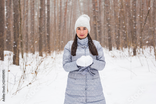 Obraz premium Christmas, holidays and season concept - Young beautiful smiling woman holding snow in hands in winter outdoors