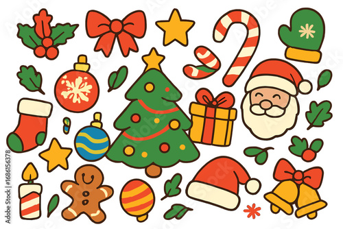 Obraz premium Christmas icon collection. Vector cartoon doodle set with Santa Claus, tree, gift, candy cane, ornament, gingerbread man. Festive holiday symbols for seasonal celebration.