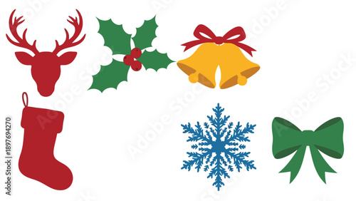 Obraz premium Christmas Icons Set: Reindeer, Holly, Bells, Stocking, Snowflake, Bow