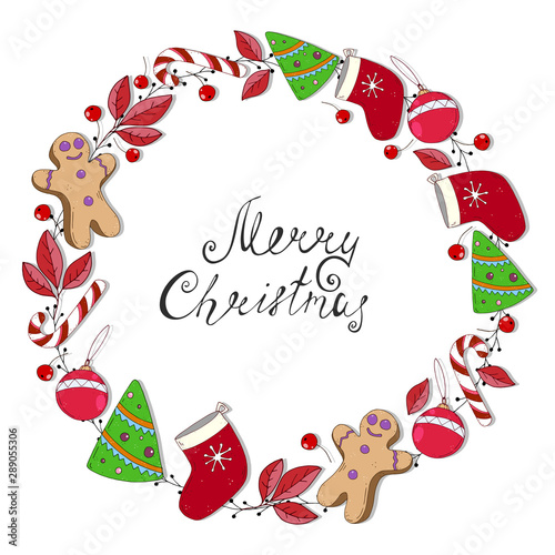 Fototapeta premium Christmas illustration. festive frame of colorful socks, gingerbread men, balls, Christmas trees and decorative elements with a calligraphic inscription. vector. hand drawing