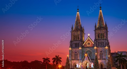 © Yuniar, Fototapeta premium Christmas in Jakarta banner background, cathedral with lights on glowing gradient