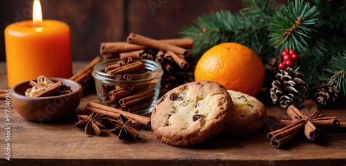 © SR Production, Fototapeta premium Christmas ingredients table with a cookies in the center on a wooden board, accompanied by orange, panettone, cinnamon, pine. Festive pine decoration on red rustic