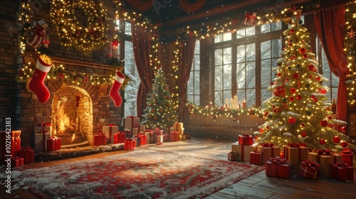 Fototapeta premium Christmas Interior with Fireplace and Christmas Tree