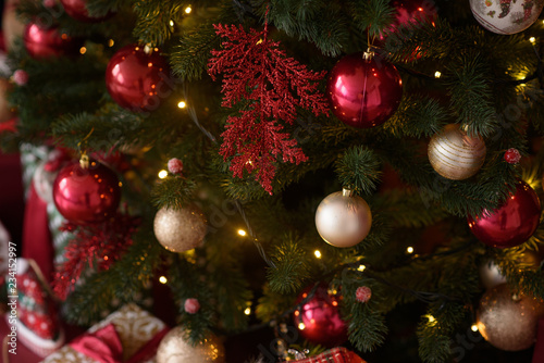 Fototapeta premium Christmas interior with gift boxes and Christmas fires. It can be used as a...