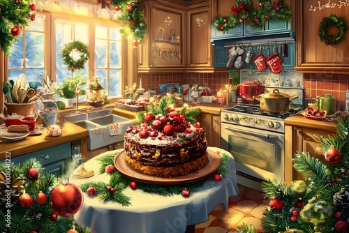 Naklejka premium Christmas Kitchen Interior: Festive Baking and Decorations