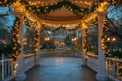 © JIALU, Obraz premium Christmas lights glowing on railings of open-air pavilion in Balloween City Square Park at dusk, decorated with wreaths, greenery, and festive garlands, city buildings in background.