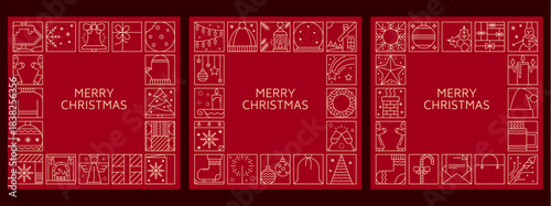 © Vector Tradition, Obraz premium Christmas line ornament invitation or greeting card. Vector banners with snowflake, bell, gift, cookie, garland, cap, house, bauble, wreath, angel, holly, mistletoe and firework on red background