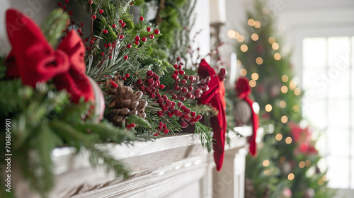 © Michael, Naklejka premium Christmas mantel with red bows and greenery