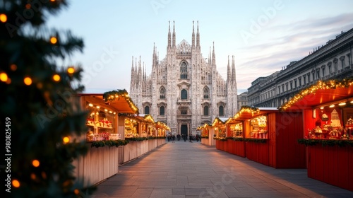 Fototapeta premium Christmas market on the Piazza del Duomo in Milan, with the grand cathedral backdrop, festive lights, and colorful stalls