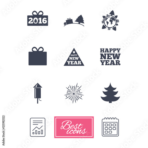 Fototapeta premium Christmas, new year icons. Gift box, fireworks signs. Santa bag, salut and rocket symbols. Report document, calendar icons. Vector