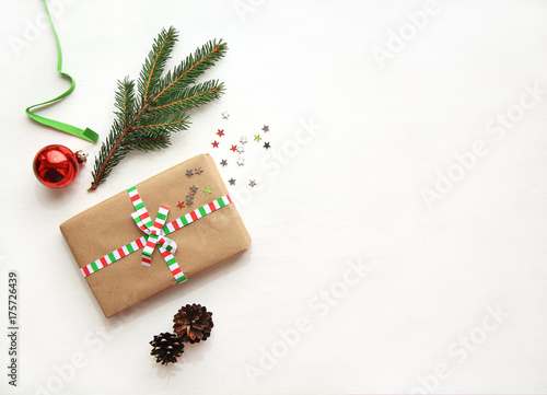 Obraz premium Christmas or New Year background with copy space. Christmas composition made of decorations: gift, red ball, fir branch, pine cones, fir branch and gift on textured white background. Flat lay.