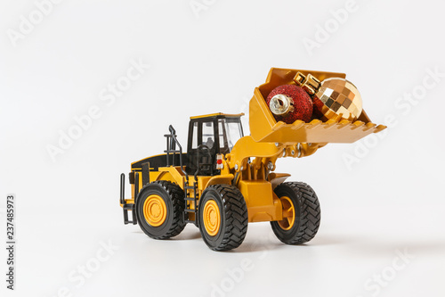 Obraz premium Christmas ornament and Wheel Loader model , Holiday celebration concept new year on white background