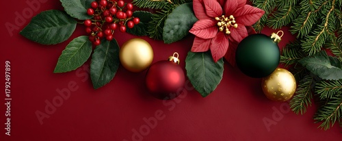 Fototapeta premium Christmas ornaments and festive decorations set on a cheerful holiday backdrop