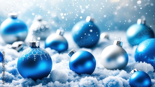 Fototapeta premium Christmas ornaments, blue and silver baubles, snow, winter scene, soft focus, bokeh lights, festive atmosphere, holiday decorations, cold color palette, glitter, shiny surfaces, macro photography, sha