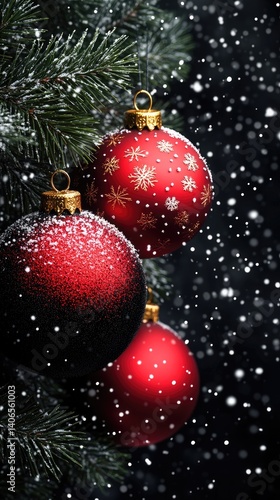 Obraz premium Christmas ornaments hang from an evergreen branch amidst softly falling snow, creating a festive ambiance