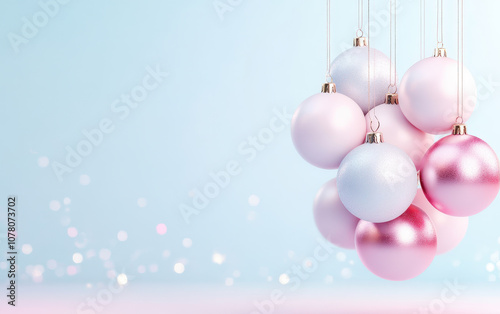 Fototapeta premium Christmas ornaments in pastel colors hanging against soft blue background, creating festive and cheerful atmosphere perfect for holiday celebrations
