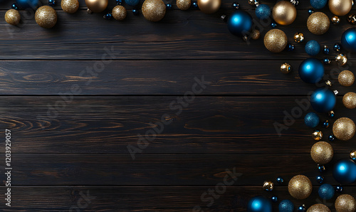 © Mahmud, Naklejka premium Christmas Ornaments on Dark Wooden Background with Copy Space