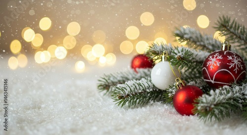 © Remotion Graph, Obraz premium Christmas Ornaments on Snowy Branch with Bokeh Lights