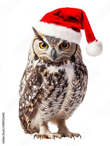 © Polina Ponomareva, Fototapeta premium Christmas owl in santa hat isolated on white background.