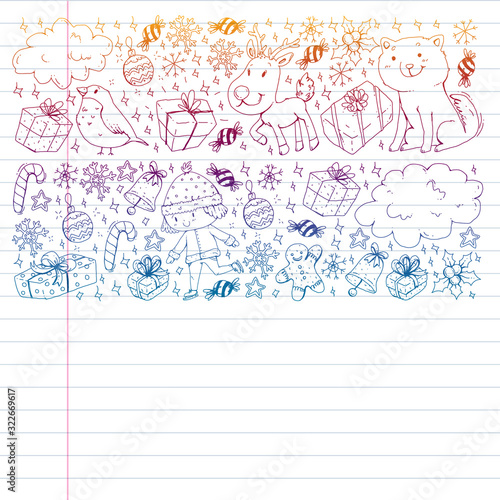 Fototapeta premium Christmas pattern with little children. Kids play and have fun during winter vacations.