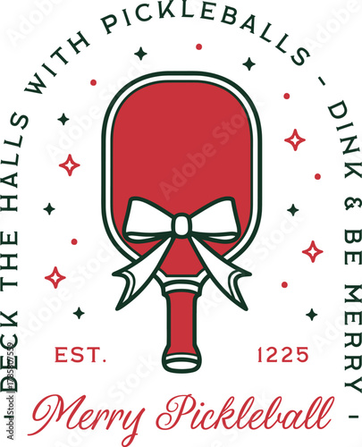 © Pictandra, Naklejka premium Christmas pickleball funny pun quotes deck the halls with pickleballs theme dink and be merry greeting card. Preppy retro paddle red green aesthetic holiday decor printable sport wishes shirt design.
