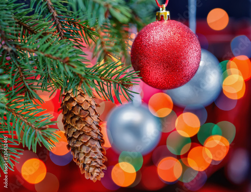 Obraz premium Christmas red ball with fir branch and cone. Focus concept.