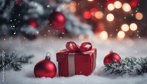 © Arif, Obraz premium Christmas red decorations on snow with gift boxes fir tree branches and christmas lights