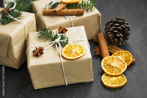 Obraz premium Christmas retro wrapped gifts with dried orange slice and fir tr