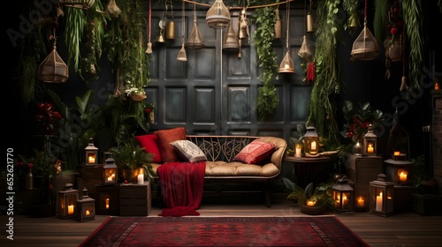 © Rabbit_1990, Naklejka premium Christmas room interior design boho style. Bright living room adorned with festive Christmas decorations. hyper-realistic photography. Generative AI