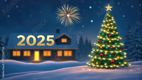 Fototapeta premium Christmas scene with illuminated tree house fireworks and 2025 text in snowy...