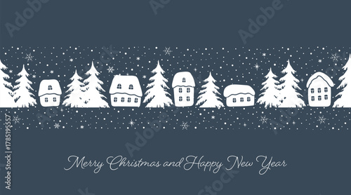 © irynaalex, Obraz premium Christmas Seamless Border. Banner. Winter Village. White Silhouettes of Houses, Trees. Snow. Snowflakes. Greeting Card, Invitation Template. Paper Cut Stencil. Vector Image on Dark Blue Background.