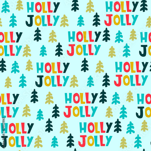 Fototapeta premium Christmas seamless pattern. Hand drawn fir trees, Holly Jolly lettering on...