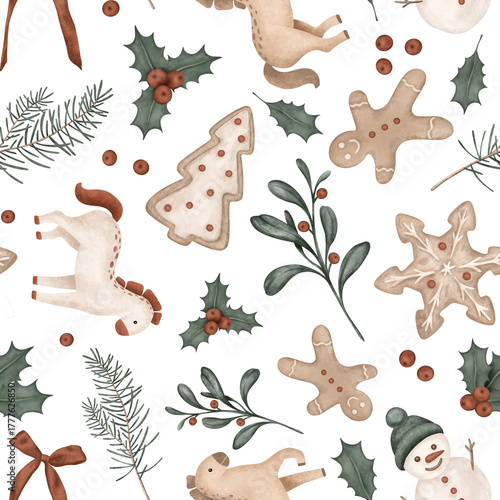 © Ekatmart, Obraz premium Christmas seamless pattern with symbol new year 2026, horses, pine branches, for tree, bow. Repeat ornament with illustration holly and red berries and sweet cookie gingerbread and snowman.
